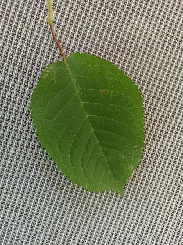 Ich habe mal ein Laubblatt von 2 Seiten fotografiert und auch ein Stück direkt am "Bäumchen". Die älteren Blätter sind ausgewachsen ca. 10 cm lang, 6 cm breit mit leicht rötlichem Stiel, jüngere Blätter etwas kleiner. Das Blatt ist eiförmig mit auslaufender Spitze, am Rand sehr fein gezähnt, weich, hellgrün, matt . Am diesjährigen Neutrieb kommt je ein Stiel mit Blatt aus dem Nodium, am Vorjahrestrieb sind es je immer 2 - 4 Blätter, die aus dem Nodium treiben.