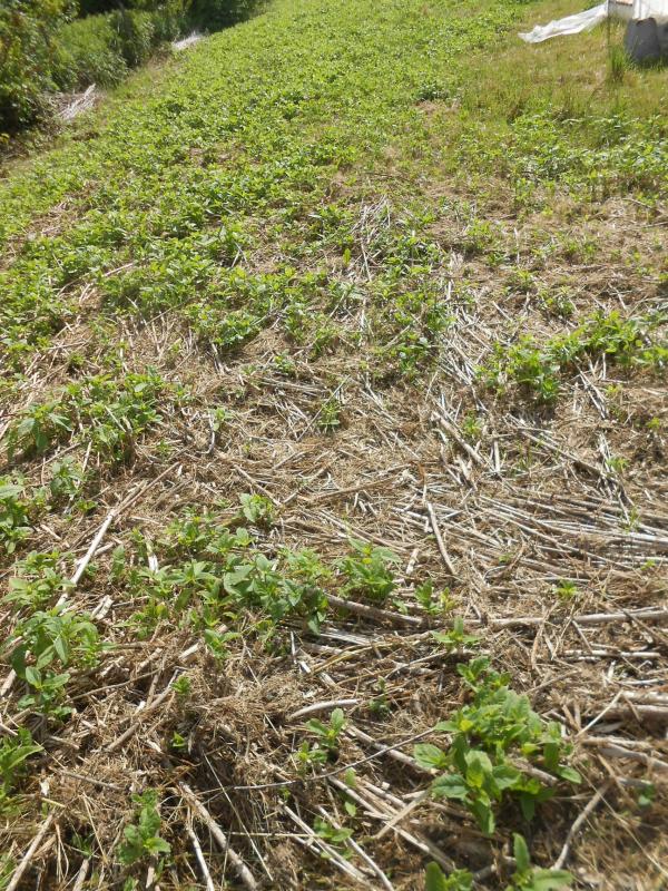 Ach, ihr macht alles so vorschriftsmäßig. Ich bin nur eine alte Witwe, die alles allein in Handarbeit macht. Nur als Spaß an der Freud, was wächst, das wächst, weil der Acker da ist. Die andere Seite ist inzwischen vollkommen mit Topinambur bewachsen. Die wollte ich im Frühjahr von einem Bauern abgemäht haben, er hat aber erst mal nur eine Seite gefräst, da habe ich mit der Hacke in krummen Reihen Kartoffeln gesteckt. Als ich die Tomaten setzen wollte, war der Rest schon wieder vom Unkraut begrünt, deshalb habe ich diese wohl oder übel neben die Kartoffeln gepflanzt (eine Todsünde), damit er mit dem großen Traktor nochmal durchfahren und fräsen konnte, weil ich auch noch Kürbisse setzen wollte. Zu diesem Zeitpunkt hat er dann die Topis abgemäht, die jetzt wieder wachsen, ebenso wie auf dem gefrästen Stück die Disteln.