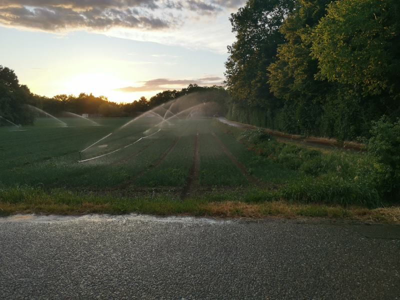 PS: hier die Gegend ist Gemüseanbaugebiet und Porree, Frühlingszwiebeln und Co. wächst hier auf vielen Hektar. Nebenan ist gerade mal wieder so ein Feld mit Beregnung (kleiner Teil siehe Foto), der Bauer kanns nachts Beregnen, er kann auch seine Frühlingszwiebeln mit Azoxystrobin vor dem Rost schützen. Wenn dort in einem Sektor 4 Stunden die Regner laufen und danach in einem anderen nochmal 4 Stunden und danach noch einer, und der zweite um 23:50 abgestellt wird, dann herrscht hier eine Luft im Umkreis, wo sich jede Rostpilzspore freut, cool, es ist Nacht und schön feucht, ich probiers mal mit auskeimen. Und einige davon haben dann auch Erfolg in der Gartenanlage nebenan, wo eben kein Fungizidbelag drauf ist und noch die Sporen von xyz aus den Jahren zyx vorhanden sind. Und so kommen solche Fotos mit orange leuchtendem Boden zustande.
