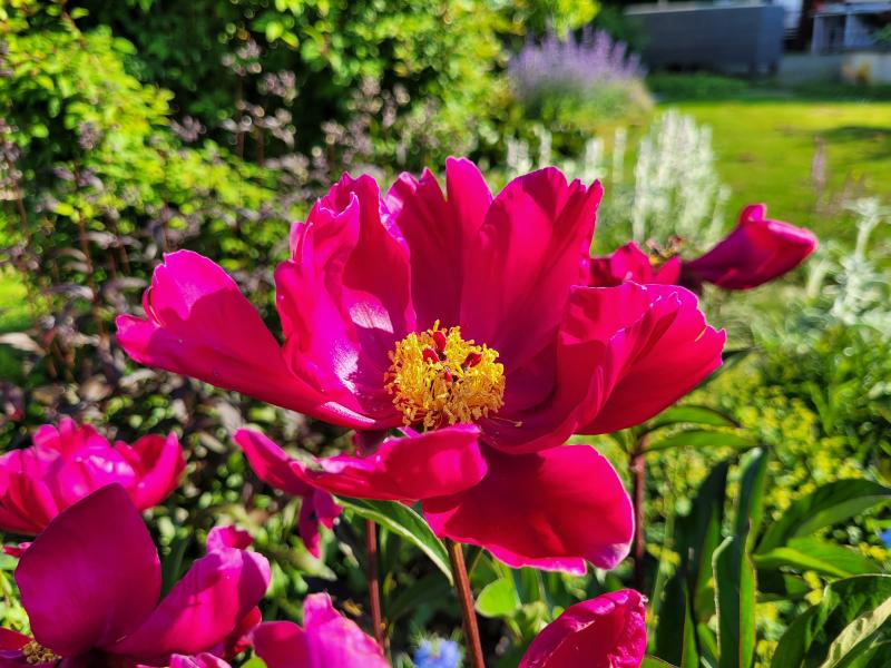 Bei einer Nachbarin wirkt die gleiche Sorte am Teich blau, weiter oberhalb in einem Beet dagegen violett.
