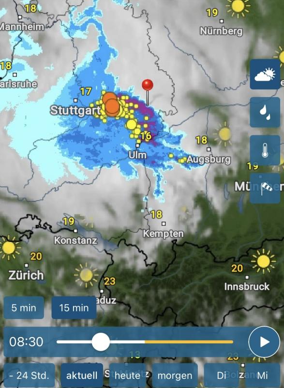 Nachdem die beiden letzten Tage wider die Vorhersagen gewitterfrei waren, zieht gerade ein heftiges Wetter ab. Auf dem Radar sieht es um 8:30Uhr schlimmer aus, als es war :-X