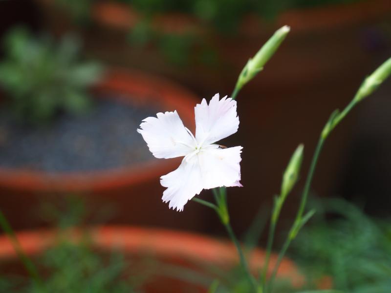 Dianthus monspessulanus ist im Netz genauso wie im großen Tontopf sehr variabel. Breite Blütenblätter, Blütenblätter mit rotem Band um das Zentrum und sehr ausgefranste Blütenblätter alle aus demselben Polster.