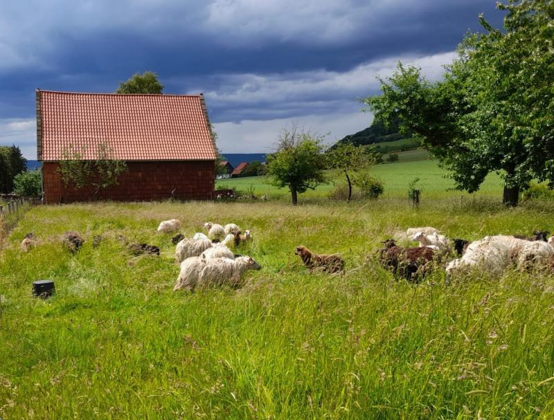 Auf der neu gepachteten kleinen Streuobstwiese muss ich nachmähen. Ich kann mich trotzdem nicht überwinden die 3 Skuddenlämmer in diese kleine Gruppe zu geben, weil Eibe zwar Estherus und Emil zähneknirschend akzeptiert. Eine Konditionierung auf uns ist mit ihr indes schwierig. Du sollst keine Götter neben ihr haben. Und dann noch braune und schwarze Lämmer. No thanks. Da hatten wir ja dieses Jahr schon eine Kostprobe, wie das einer Schnuckenmutter den letzten Nerv kosten kann ::)