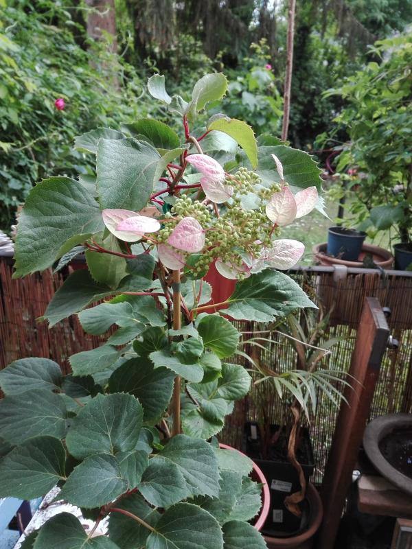 Ich habe eine Kletterhortensie hydrangeoides Roseum erworben und erstmal in einen größeren Kübel gepflanzt. Nach ein paar Wochen lässt sie auf einmal die einzige Blütentraube hängen. Sie hat die Außenblüten schon gebildet. Vorher hat sie sich dynamischer angefühlt jetzt scheintsie auf einmal etwas schlapp. Ich dachte vielleicht liegt es an der neuen Erde, ich hatte dort ein paar Rinderdungpellets beigefügt. Ich habe sie jetzt wieder aus aus dem Topf und nur mit ihrem alten Erdballen in einen kleineren Topf gesetzt und mal gründlich durchgespült. Ich hoffe sie fängt sich wieder. Wasser bekommt sie genug aber nicht zuviel. Hatte bisher nur Hydrangea petiolaris. Sie steht im Halbschatten. Oder ist das normal dass die Blüte sich neigt weil sie schwerer wird? Bild folgt gleich.
