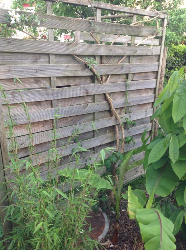 Hier habe ich es nach Jahren mit von Schnecken getöteten Sorten geschafft Clematis montana 'Mayleen' zu etablieren. Der Austrieb ist verholzt, da geht nix mehr für die Schleimer.