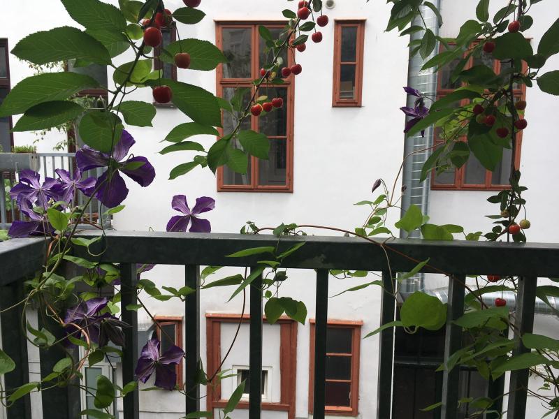 Von außen sieht es sehr hübsch aus: ‚Jackmanii‘ mit den roten Weichseln. Von unserer Seite sieht man sie leider nur von hinten. ::)