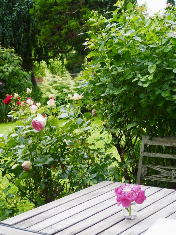 Momentan dominieren noch die letzten Paeonien und Rosen im Garten, Vorne Paeonia "Marie Stuart" , eine späte in Vollblüte, dahinter links die Reste von Paeonia "Coral Charme", die langsam von der Albarose "Chloris" eingenommen wird. Aber Coral Charme ist ja im Prinzip ein Unkraut.