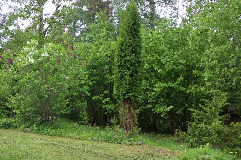 Zum Standort und dem Rest des Grundstückes: diese Flieder-Thujen-Kombi steht westlich vom Haus, ca 5 Meter von der Hauswand entfernt und quasi parallel zum Haus. Direkt dahinter ist ein kleiner Abhang und noch etwas dahinter Dickicht/Wald, wo es noch weiter runter geht. Links steht noch ein größerer Busch (siehe erstes Bild), damit hört diese Reihe quasi auf. Ein Stückchen weiter rechts von der großen Thuja führt eine kurze Treppe aus alten zerfallenen Betonplatten und Bruchstein nach unten, schräg hinter der Thuja wächst ein Wachholder. Das Grundstück selbst ist an den meisten Seiten von Bäumen/Wald umgeben, nur gen Süden hin "offen". Da sich der Vorbesitzer in den letzten Jahren nicht mehr viel gekümmert hat, ist hier momentan alles recht verwildert. Vieles wird auch in Zukunft eher "wild" bleiben, aber ein paar Beete würde ich schon anlegen wollen, gerade in der Nähe des Hauses. Diese Stelle würde sich dafür eigentlich anbieten, von daher wäre eigentlich auch die Idee mit dem Staudenbeet gar nicht mal so schlecht. Auf der Südseite unseres Grundstücks wachsen unter anderem Pfingstrosen, Fetthennen und Lupinen, aber es gibt sicher auch andere Stauden, die hier wachsen.
