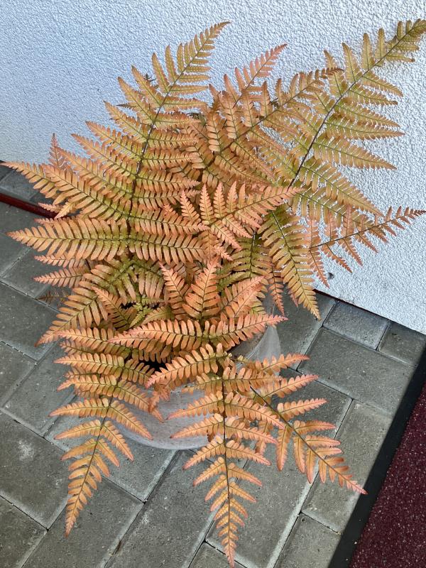 Bei mir ist der Rotschleierfarn im Austrieb genauso orange-bronzefarbig. Der ist aber erst frisch gepflanzt... ich weiß also nicht, wie er sich in den kommenden Jahren beim hiesigen halbschattigen Standort entwicklen wird. Im Sommer vergrünt er dann...