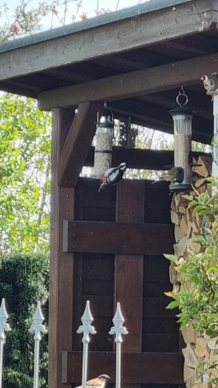 Ein Specht hat die Erdnusssäule in unserem Garten entdeckt. Nach häufigen Besuchen von ihm ist das Drahtgeflecht deutlich eingedrückt 8).