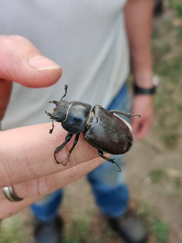 Er hat heile Flügel, also ein weiterer Hirschkäfer. Aber von der anderen Seite fällt mir auf, dass das linke hintere Bein fehlt. Die leben wohl gefährlich? :-[