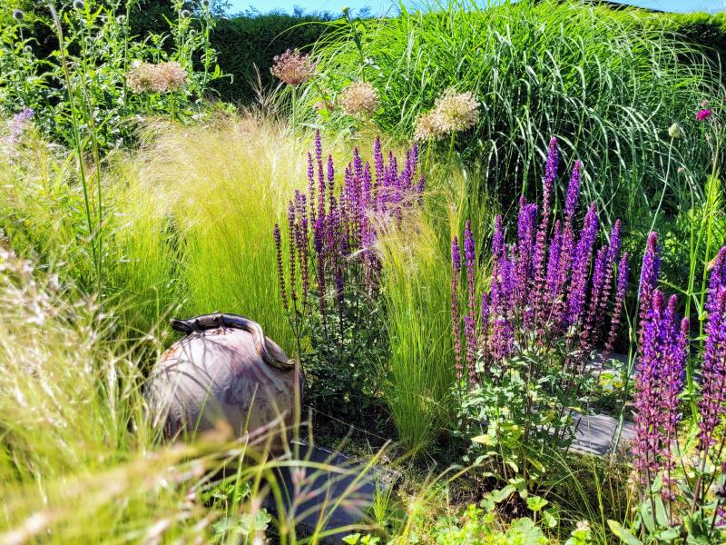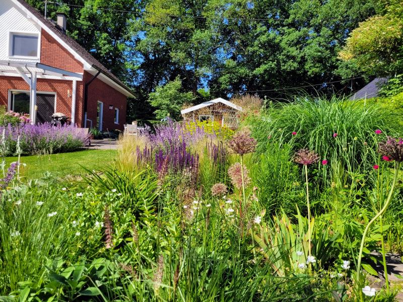 wunderbar, so üppig... und daran würde ich auch nichts ändern. Aber vielleicht könnte im Beetvordergrund eine kleiner Strukturwechsel schon für einen optisch ruhigeren Eindruck sorgen. Ein oder zwei Pflanzen mit großem, ausdrucksstarkem Laub würden schon erheblich mehr Ruhe reinbringen... Funkien zum Beispiel oder Ligularie Dentata oder anderes. Im Beetvordergrund sind das für mich sonst vielleicht doch etwas zu viele ähnlich filigrane Strukturen.
