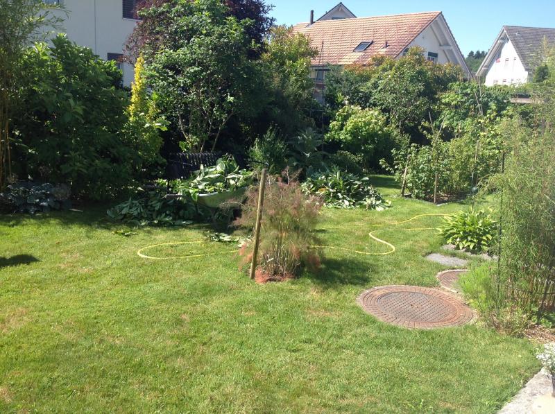 Ich konnte es heute nicht lassen und habe zur Unzeit (Gärtner würden die Hände ringen) eine große Umpflanzaktion gestartet. Im langen Schattenbeet zunächst die Akeleien heruntergeschnitten, diverse Carex 'Everillo' rausgenommen, weil sie aus der Ferne aussehen, als wären sie am Verdursten, stattdessen große Hostas in die Lücken gesetzt, auch noch eine Berberis thunbergii 'Aurea' und schließlich Fuchsia magellanica und Veratrum nigrum besser platziert. Ich habe alle Pflanzen in Modderlöcher gesetzt und dann nochmal ordentlich gegossen. Morgen wird sich zeigen, ob sie beleidigt sind.