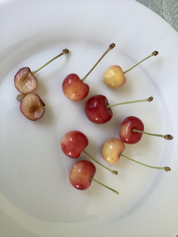 Und rotbunten Kirschen, also gelbe/ „weiße“ Kirschen mit roten Bäckchen, z.B.