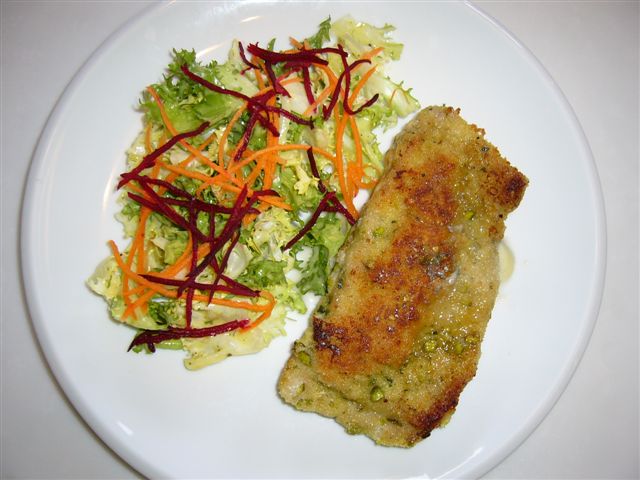 Heute mittag gab es Cordon-Bleu mit Gorgonzola, paniert mit Nüssen und Pistazien, dazu einen Salat
