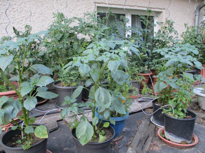 Die Tomatillos keimten dieses Jahr miserabel ::). Und verdammt spät. Und dann waren das so ne Mickerlinge, dass ich überlegt habe, ob ich die überhaupt in die großen Kübel einpflanzen kann oder ob sie dort wieder verschwinden :(. Hab sie dann doch gepflanzt, Bewässerung rein und die letzten Wochen nicht weiter beachtet. Heute war ich ganz erstaunt, wie gut die sich entwickelt haben :D. Blüten sind auch schon dran :). Yippie!
