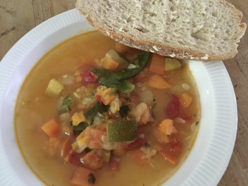 Tochter hat gestern Abend Gemüsesuppe gekocht, die hat für heute auch noch gereicht. Dazu italienisches Brot und Parmesan, der hat es allerdings nicht aufs Foto geschafft.