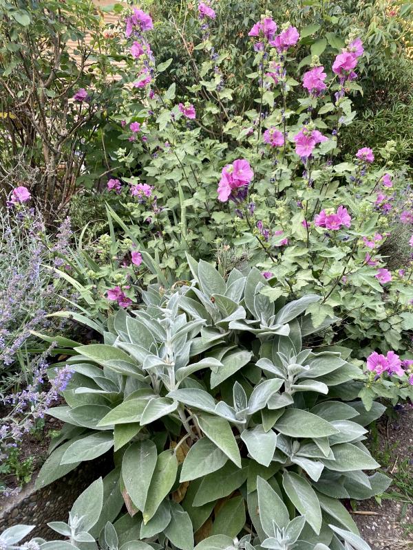 Und da ich so ein Fan von Stachys Big Ears bin, hier auch nochmal ein Gestaltungsbeispiel von mir zusammen mit Buschmalve „Kew Rose“ und Nepeta „Six Hills Giant“