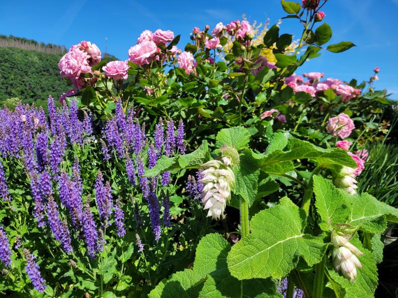 Silphium perfoliatum wurde schon genannt. Meine 4jährige Pflanze hat einen Durchmesser von 1,20 m und ist schon über 2 m hoch. Wird nie gegossen und nie gedüngt. In Kürze fängt die Blüte an, die mehrere Wochen lang anhält. Eine Pflanze wurde noch nicht genannt: der Muskatellersalbei. Den habe ich extra für "meine" Holzbienen angeschafft. Blüht auffallend schön und wochenlang und die Holzbienen sind von früh bis spät in den Blüten. Sehr große Blätter und sät sich auch aus. Für unsere Rosenausstellung habe ich einige Rispen geschnitten und die haben im Wasser gut gehalten. Also ein weiteres Plus.