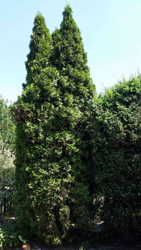 Es muss Thuja occidentalis ' Smaragd ' heißen. 'Smaragd ' ist denkbar, wenn er streng säulenförmig wächst.
