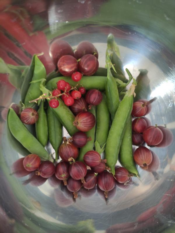 Unser jüngster hat ein paar Erbsen, Erdbeeren und Johannisbeeren genascht, und ich habe zum ersten Mal überhaupt eigene Zucchinis geerntet.