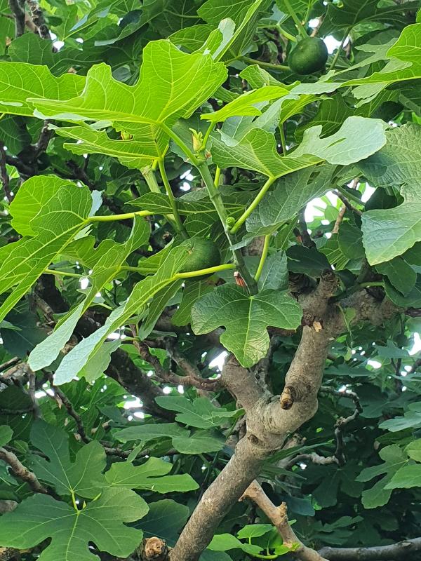 Ein paar Früchte von unsrer Brown Turkey sind schon reif. Zwischen Blühfeigen ist eine Herbstfeige gewachsen.