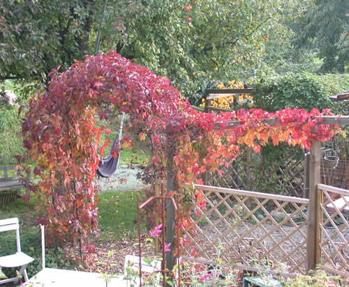 Die Wilde Rebe steigt vom Rosenbogen nun auch auf die Pergola über. Jeden Herbst ein farbenprächtiges Schauspiel. In der vorherigen Bilderreihe das zweitletzte Bild, nun im November "Bogen und Pergola".An der alten Holzleiter wachsen Bobby James und Mari Lisa über die Bambusstäbe in den alten Apfelbaum.