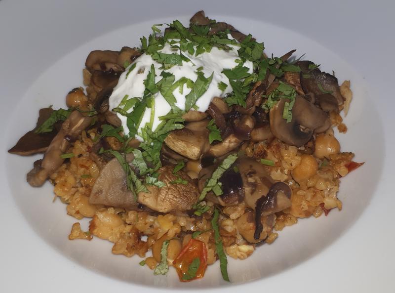 Blumenkohl-Bulgur mit Kichererbsen und Tomaten, dazu gebratene Champignons mit Zwiebeln, Käuterquark und Gurkensalat