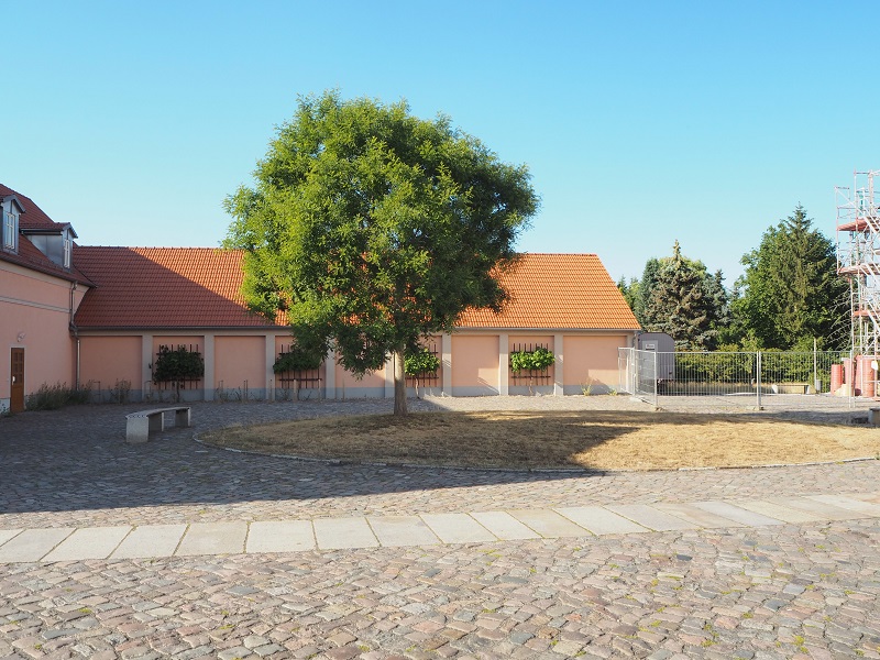 Dieser Baum wurde 2011 gepflanzt und verträgt ganz offensichtlich große Trockenheit. Es entstammt einer Herkunft aus dem sowjetischen Mittelasien. Den Stamm habe ich mit Gewalt (Spanngurt und Pfähle) schnurgerade bekommen. Oben auf dem Stamm sitzt die Krone wie ein Krähennest. In diesem Jahr wird der Baum seine erste Vollblüte haben. Das bedeutet, dass über Wochen jeden Tag tausende Blüten zu Boden rieseln. ;D