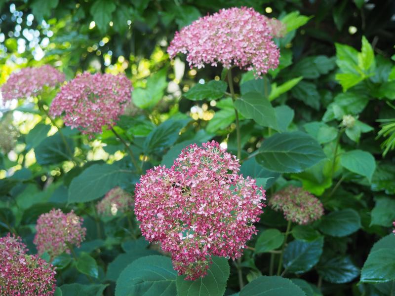 Hydrangea pink Annabelle im Schattenbeet. Leider hält sich die Blüte nicht so lange wie bei den meisten anderen Hortensien.
