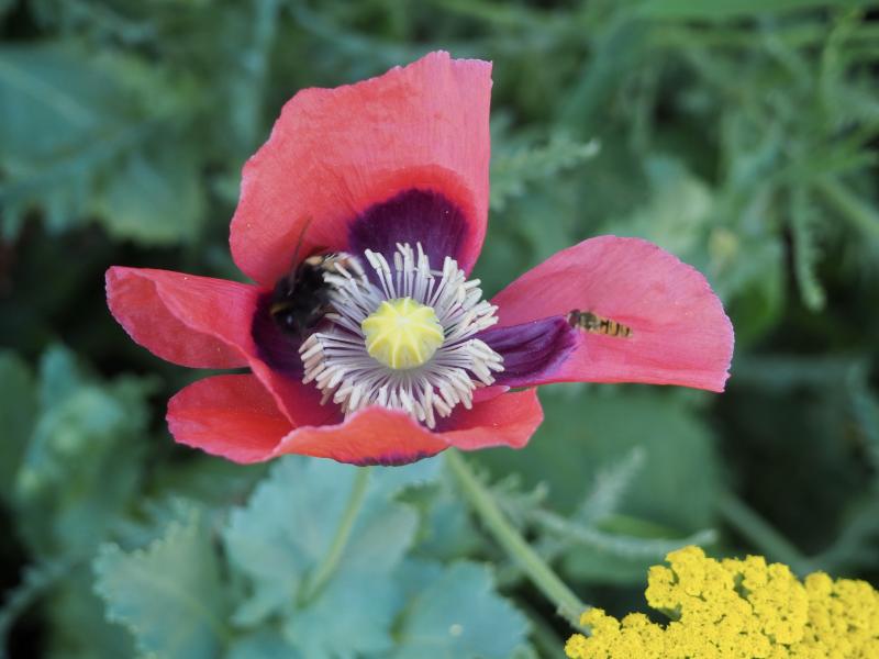 Und der Schlafmohn mit tierischem Besuch von dicker Hummel und Schwebfliege.
