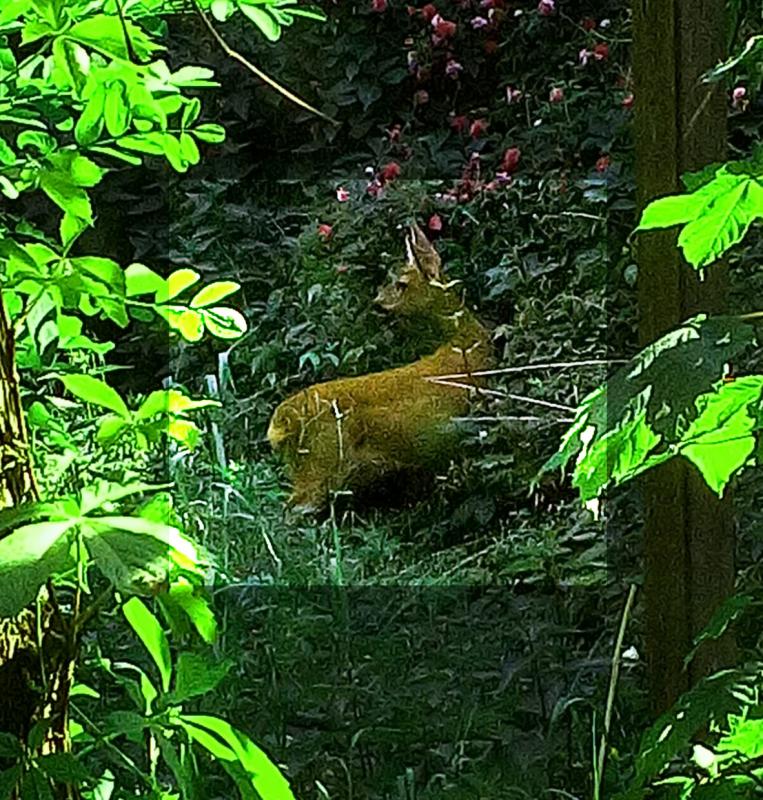 Ja.. vorgestern traf ich mittags ein Rotwild vorn im Garten, das hier war wohl ein Reh. Denk ich zumindest. Wir müssen nun doch nen Zaun zum Nachbarn bauen. Unser Zaun zum Wald ist dicht, seiner nicht... da kommen sie neuerdings rübergewandert :-X.