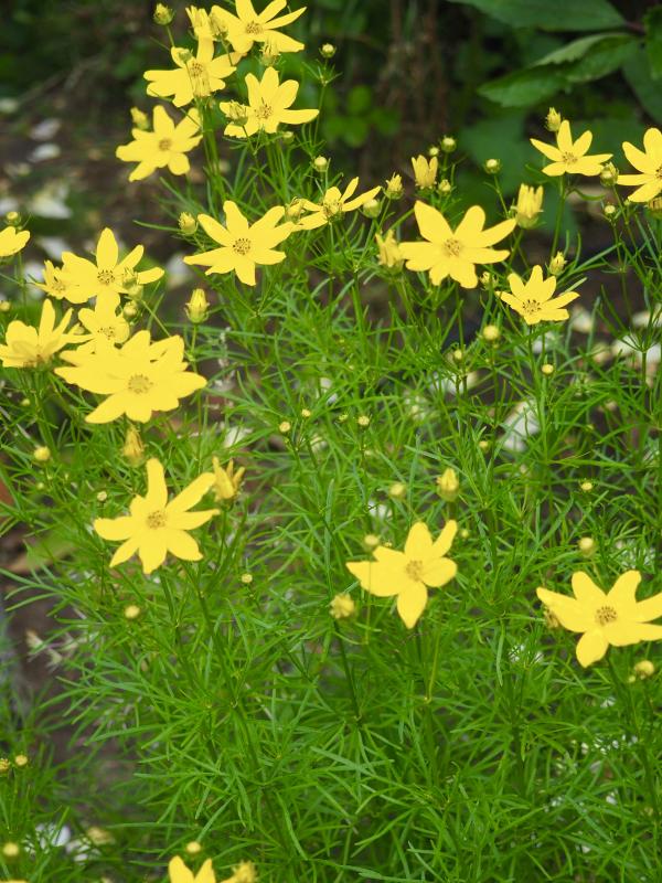 und dann noch ein anderes Gelb mit viel zarterem Laub. Coreopsis verticillata.