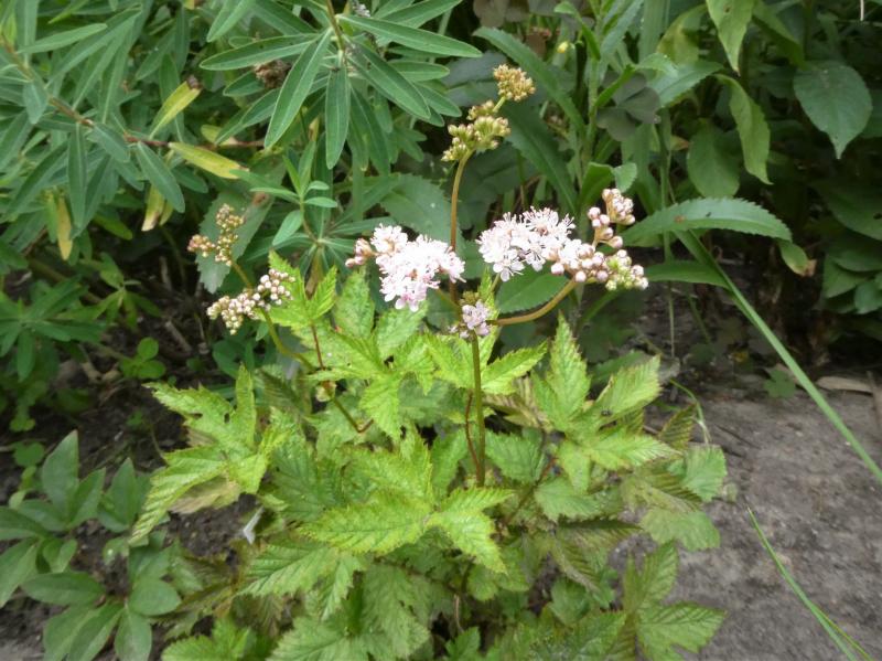 Der zweite ist ein Spontansämling, den ich dieses Jahr erst unter einem Birnbaum entdeckt habe. Obwohl er reinweiß blüht, ist es offenbar kein (reinblütiger?) Filipendula ulmaria, da die Form des Blütenstands nicht so langgestreckt ist und auch eher an Filipendula purpurea erinnert.