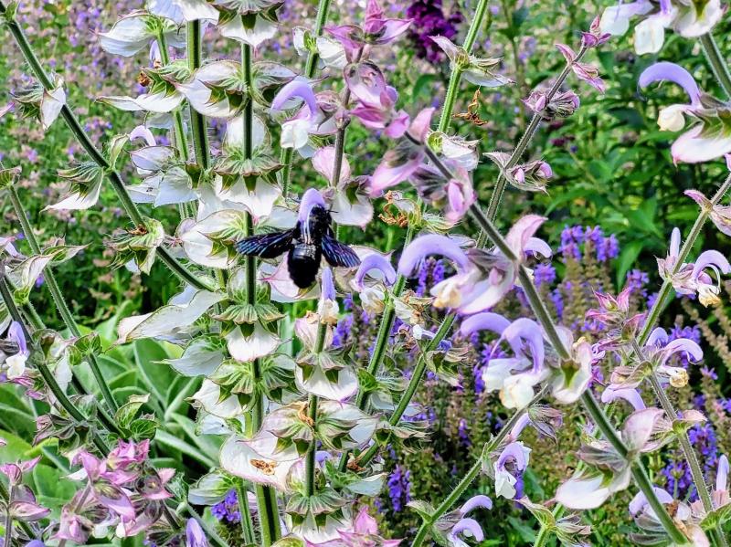Heute auf meinem Muskatellersalbei, ein sehr großes, schwarzes Insekt. Aussehend wie eine Fliege. Aber mindestens so groß wie eine dicke Hummel. Etwa so groß wie eine Hornisse nur dickerer Leib. Schwirrt immernoch dort herum... Was ist das ? ???