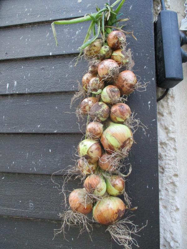 Vorgestern hatte ich die Wintersteckzwiebeln rausgemacht. Heute wurde daraus ein Zwiebelzopf :). Etwas struppig. Aber beim zweiten wäre ich wieder in Übung - nur reicht die Ernte leider nie für zwei Zöpfe ...