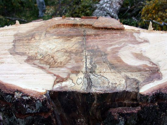 Und der Querschnitt zeigt deutlich den senkrecht verlaufenden dunklen Spalt, der durch den Blitzschlag verursacht wurde, und das braune faulende Holz im Innern, unter dem sich am nächsten Tag, als ich den Stumpf noch einen halben Meter abschneiden lasse, eine Höhlung mit moderndem Holz von ca. 50cm Durchmesser auftut.Die Beseitigung der dadurch zunehmenden Gefahr eines Umsturzes in die umgebenden Gebäude hat mich dann ein bißchen über den Verlust des schönen Baumes hinweggetröstet.