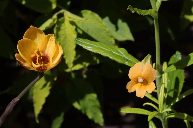 Auf der Terrasse blühen Habranthus tubispathus und Diplacus grandiflorus.