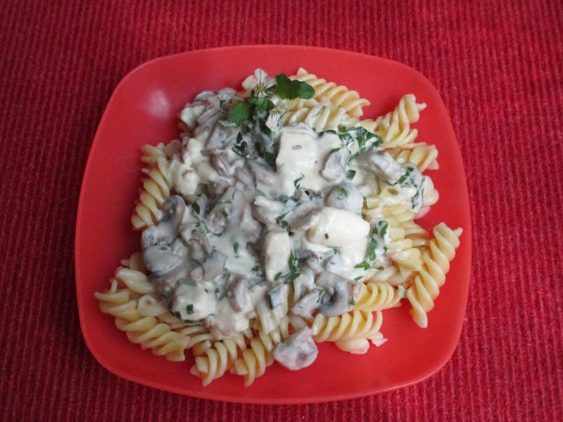 Heute gab es Spirellen mit Sauce aus gebratenen Champis, viel Ruccola und Frischkäse/Quark/Feta. 'Türlich wieder mit Blume - diesmal etwas unauffälliger.