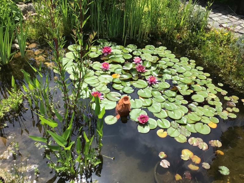 Ich habe zwar viele Seerosen, jedoch ist bei mir nicht der überwiegende Teil mit Seerosen bedeckt, da ich den Teich vor eineinhalb Jahren komplett gereinigt und ausgeräumt habe. Die neuen Pflanzen sind zwar schon wieder gewachsen