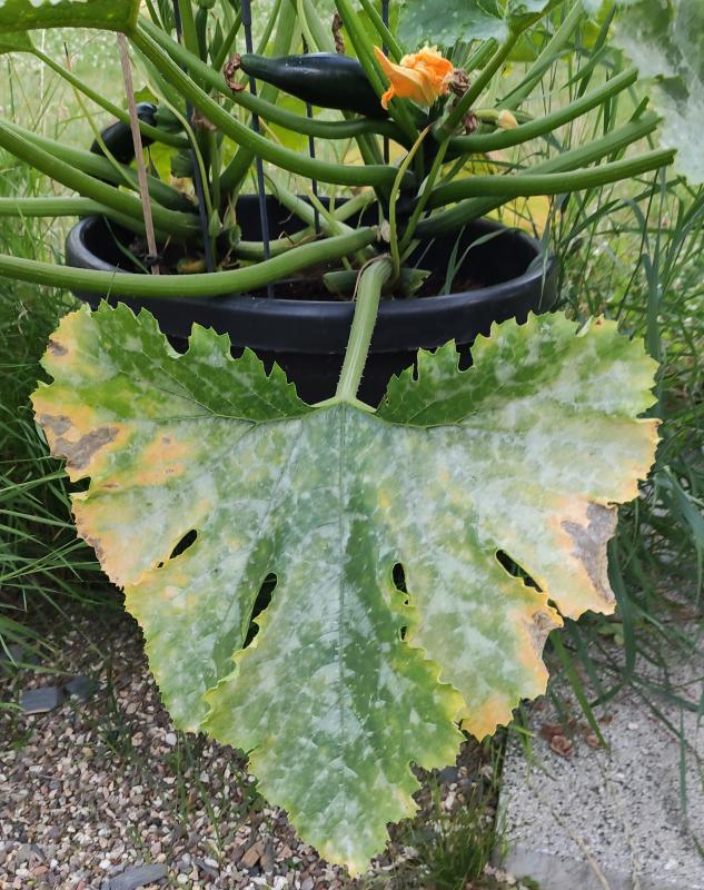 Die Pflanzen haben hier allgemein sehr viel Zucchini dran sitzen, die alle sehr hell sind ( Sorte Coucourzelle) , aber nur diese sieht so aus. ???