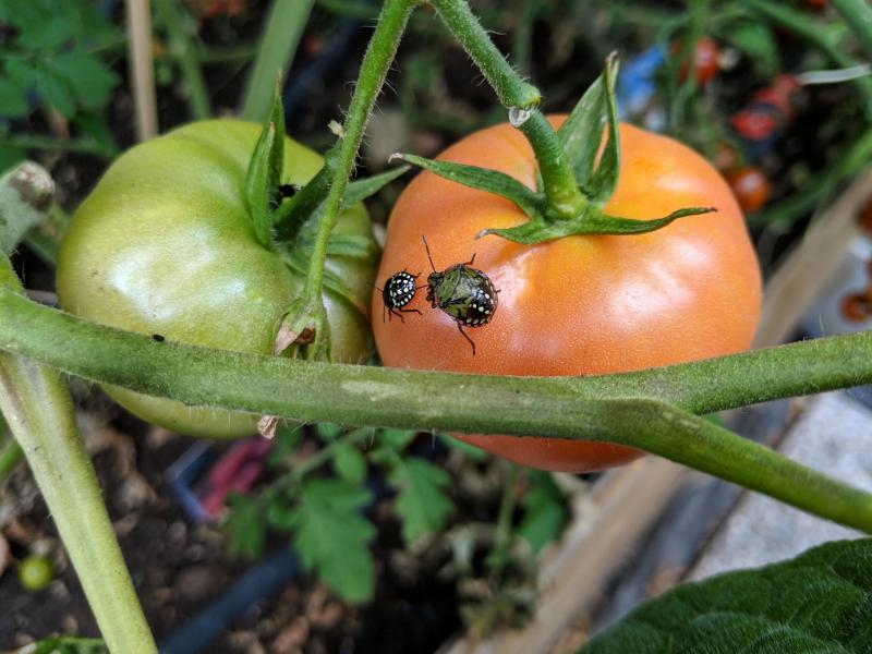 Es hat so gut begonnen mit den Tomaten und Fisolen und plötzlich sind die meisten Früchte einfach nur noch zum weg schmeißen. Tausend kleine Einstichwunden die die Früchte verschrumpeln, vertrocknen und faulen lassen. Mit jedem Stich wird eine Flüssigkeit injiziert die die Früchte ungenießbar macht. Schuld sind diese unschuldig dreinsehenden Gesellen. Grüne Reiswanzen in all ihren bunten Nymphenstadien gemischt mit den rein grünen adulten Tieren. Diesen Biestern ist einfach nicht Herr zu werden. So viele kann man gar nicht umbringen. Für jede die man killt kommen zwei Dutzend nach. >:(