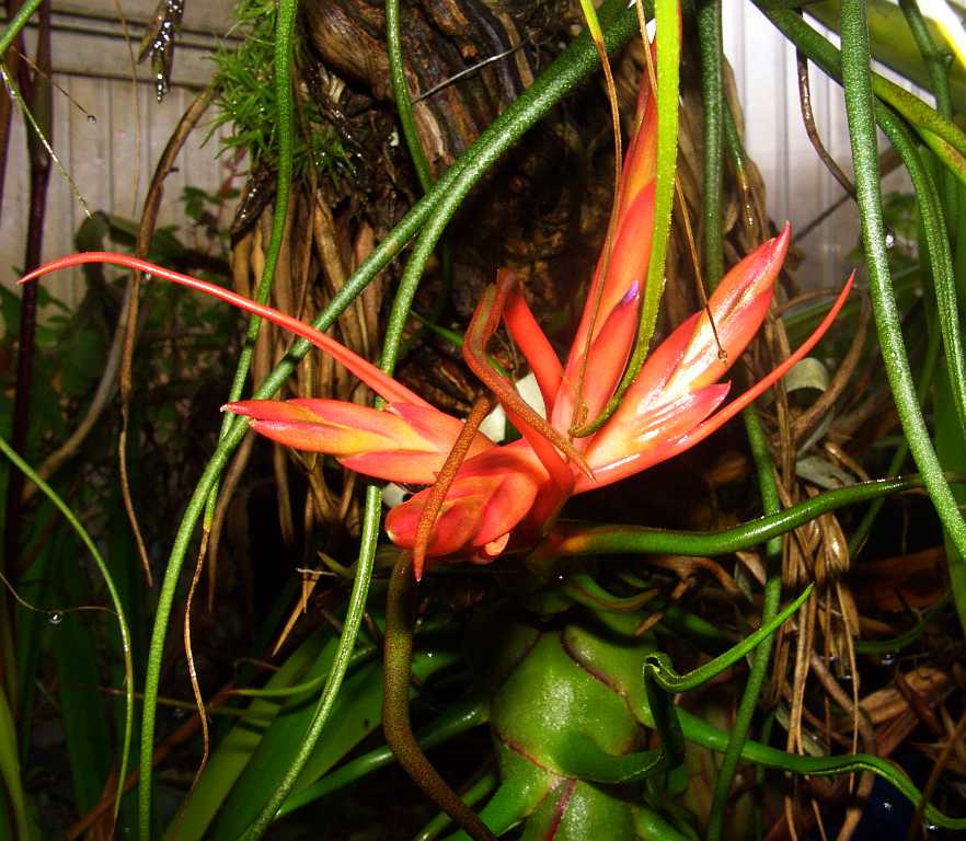 Immer wieder kommen jetzt Tillandsien in Blüte, hier die in Kultur überaus häufige Tilllandsia bulbosa. Links dahinter sieht man spontan gekeimte Tillandsiensämlinge.