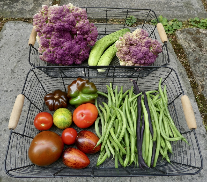 in den letzten Tagen nach und nach geerntet: Tomaten, zwei Paprika (eine ist schon verspeist), drei Zucchini, Borlotto-Bohnen.