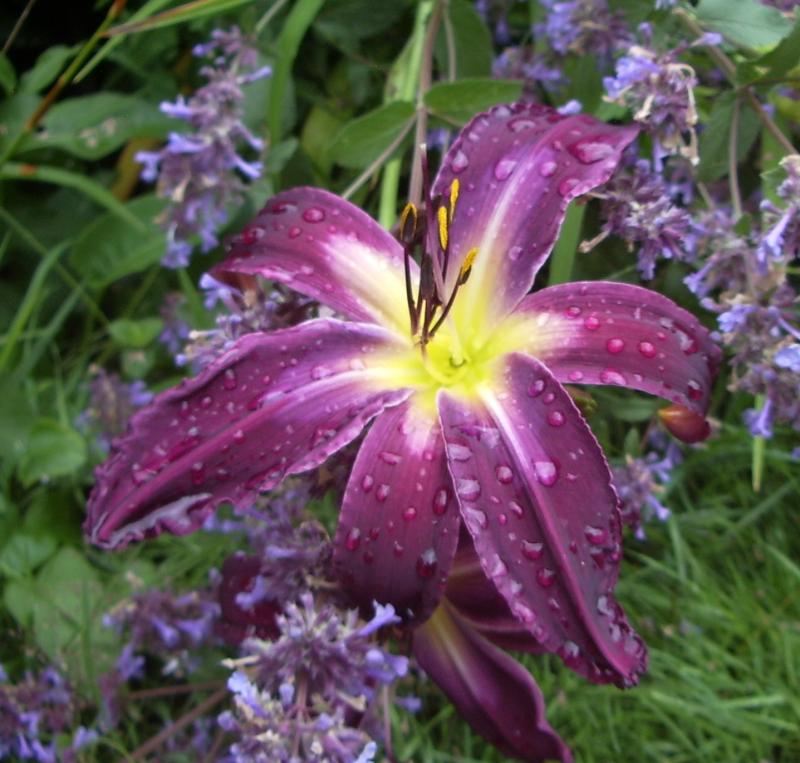 Auch der 'Berleyer Nachtgesang' (n. reg.) war mir trotz kleinem Schönheitsfehler ein Foto wert. Ich mag den, wie er so über den umlagernden fluffigen Blütenwolken von Nepeta 'Bramdean' schwebt (aber nächstes Jahr kriegt die Minze trotzdem einen Reifen drum...)