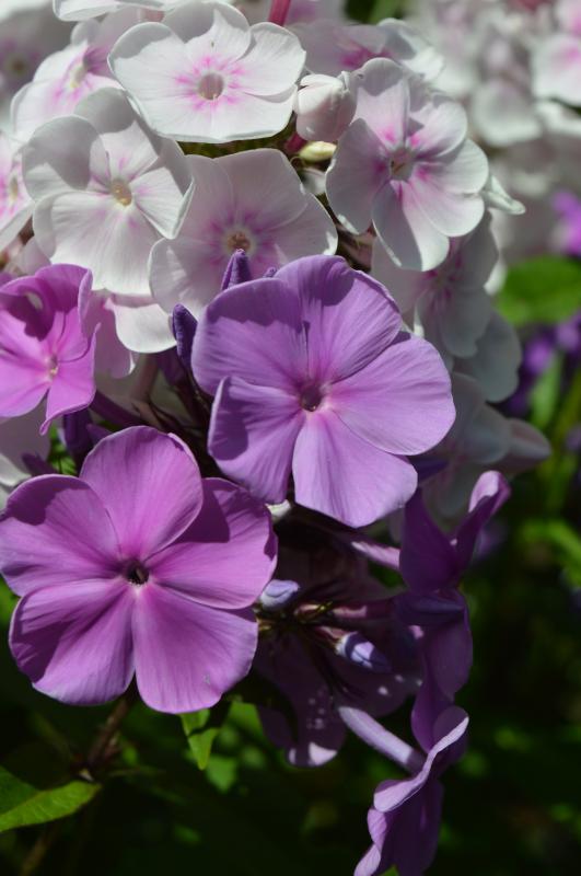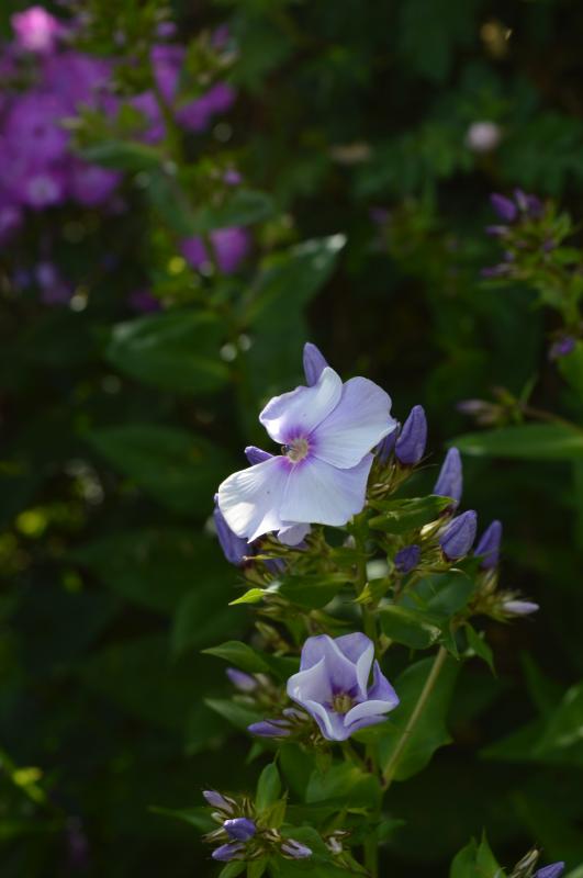 und nochmal der Phlox mit Farbwechsel, fängt violett an und vergraut dann, nur das Auge bleibt dunkel. (dahinter ist ein normaler violetter), die Pflanze hat auffallend hellgrüne Blätter, ist aber gesund