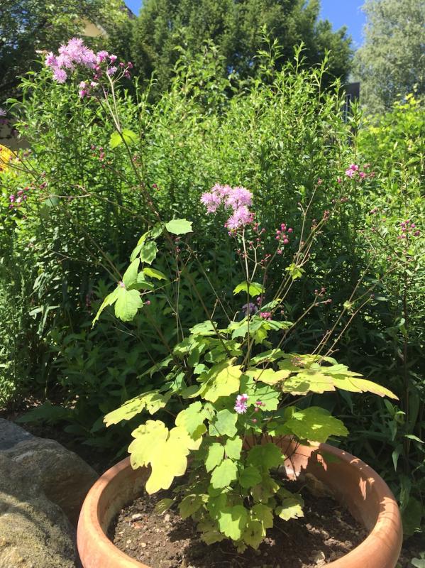 Zwei Thaliktrum delavayi sind aus dem grossen Garten am Neuenburgersee in den kleinen am Zürichsee umgezogen. Sie wurden aus suboptimalen Pflanzstellen ausgebuddelt, in Töpfe gepflanzt, haben den milden Winter am neuen Ort ohne Schutz überstanden und blühen nun hier in der prallen Sonne. Die weisse kommt auf gut 180 cm. Die lilane auf Kniehöhe ( je nach Knie...).