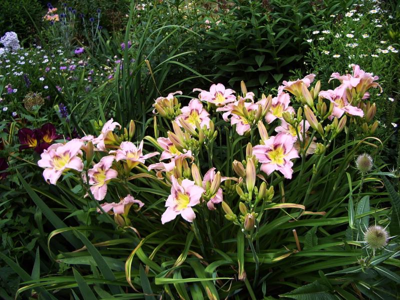 wer wohl? Es gibt genau zwei Typen hier bei den Taglien, die so Wasserfälle von Taglilien zeigen ohne Sortennamen, also völlig beziehungslos. Oder zusammenhanglos, undefinierbar, so vor die Füße gekotzt. Platsch! . Heute Fariy Tale Pink.