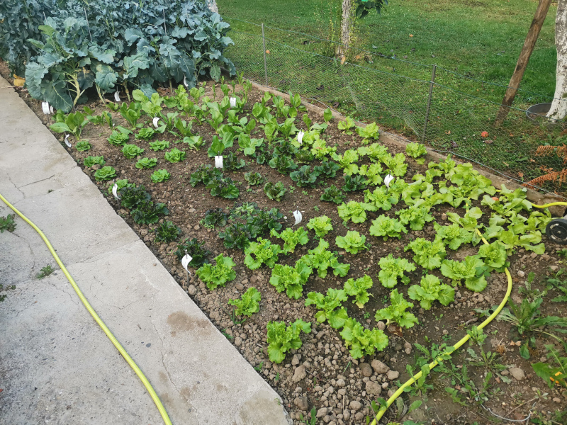 Catalogna ist ganz rechts hinten vorm Kohl der Block, der am wenigsten wächst. Vorne ist Unkraut, Löwenzahn der wieder austreibt.