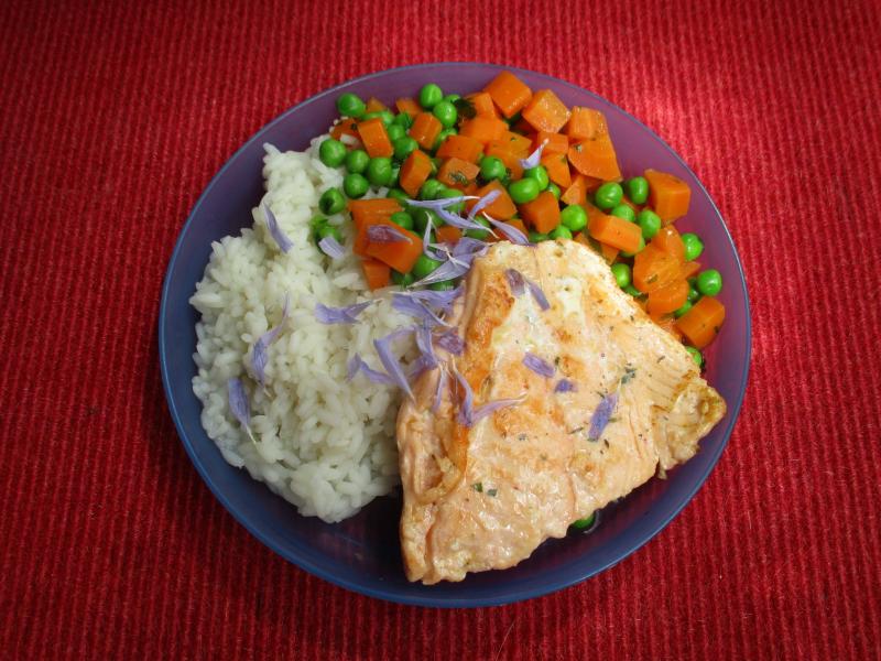 Lachsspitzen (mit rosa Salzmischung und Leinöl), Reis und Mischgemüse